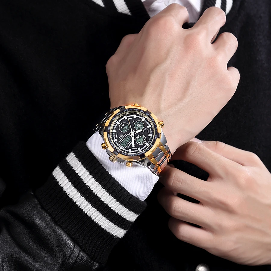 Goldnehour Steel Strap Watches For Men Military Sport Quartz Wristwatches Led Digital Hours Clock Men Relogio Masculino