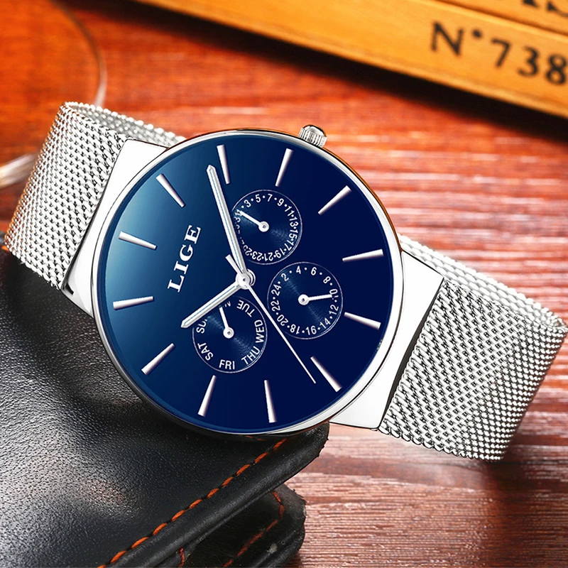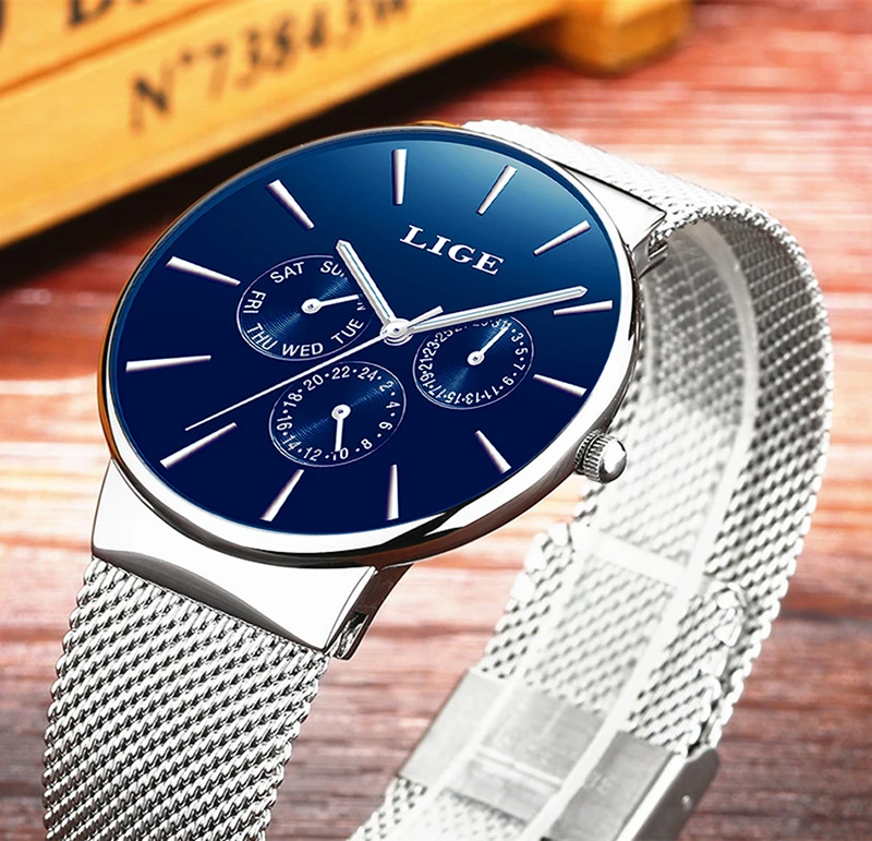 Lige Womens Watches Top Brand Luxury Analog Quartz Watch Women Full Blue Mesh Stainless Steel Date Clock Fashion Ultrathin Dial