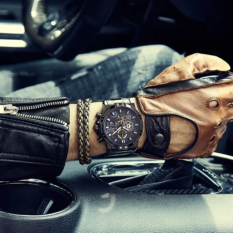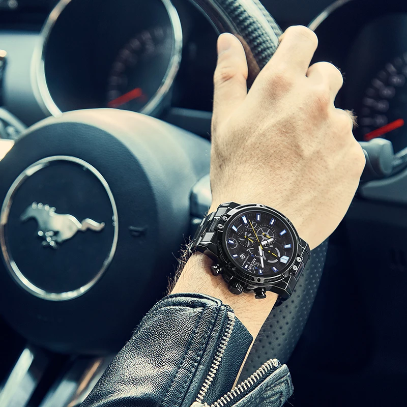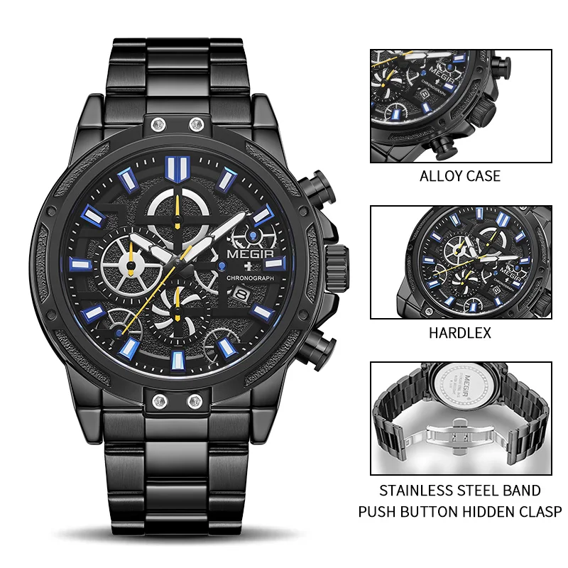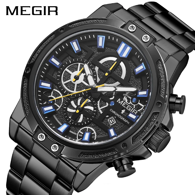 Megir Black Stainless Steel Mens Watches Brand Luxury Luminous Waterproof Quartz Watch Relogio Masculino Dropshipping