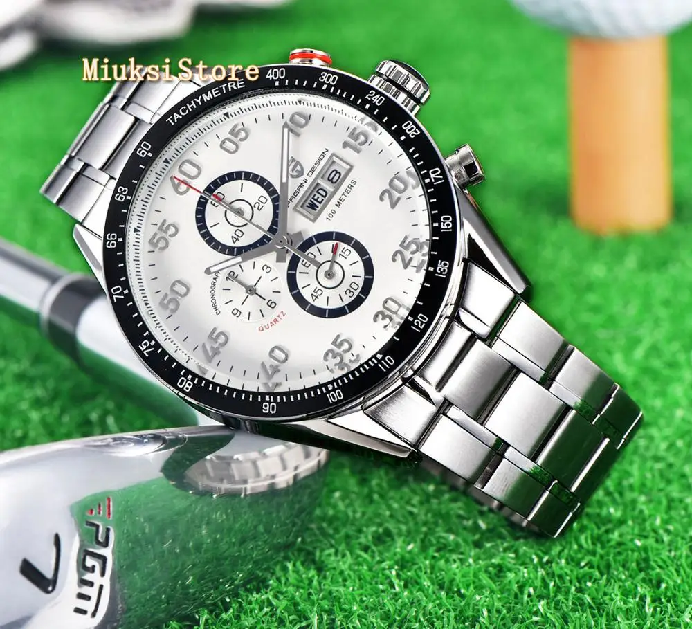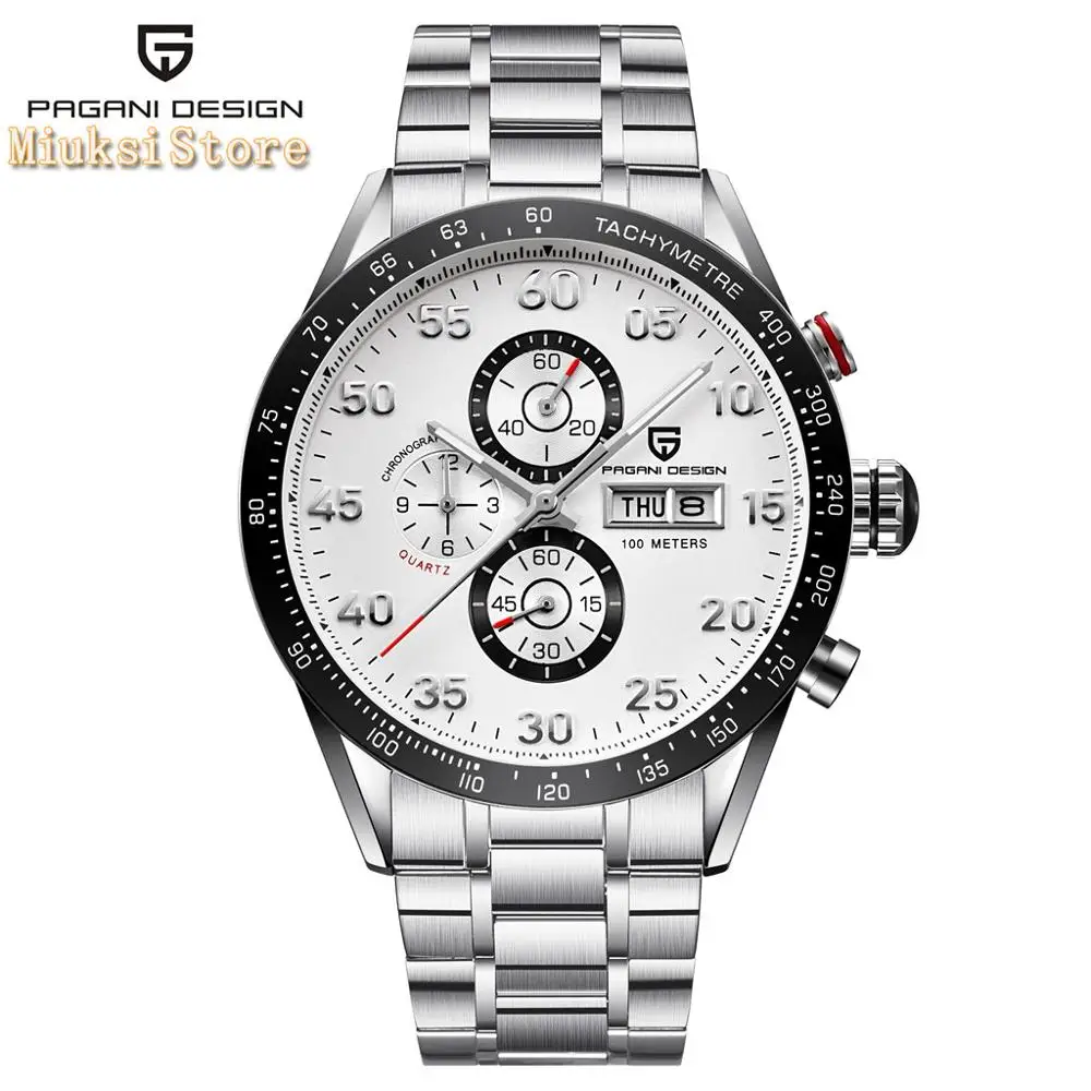 2019 New 44Mm Pagani Design Top Watch Silver Steel Case White Dial Quartz Sport Luxury Multifunction Men Wristwatches